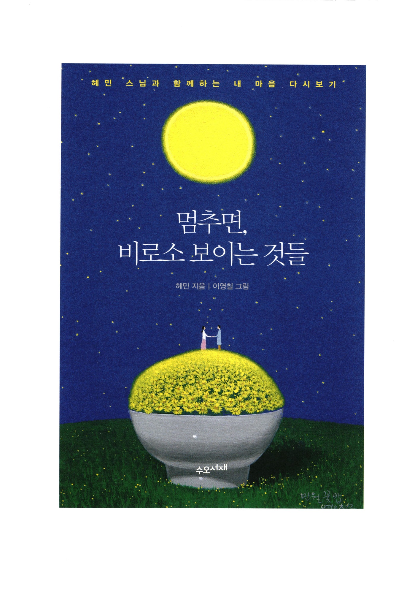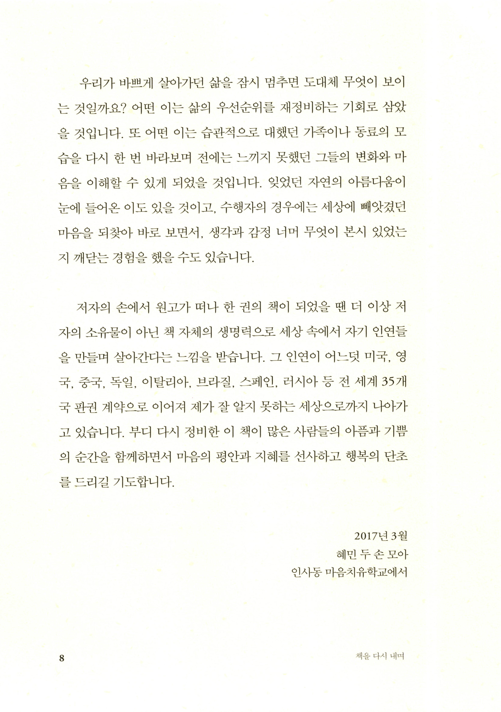 이 책은 한국뿐 아니라 여러 나라에서 큰 반향을 일으킨 해민 스님의 대표작입니다. 바쁘게 흘러가는 삶 속에서 스님은 우리에게 잠시 멈추고 호흡하며, 자기 자신과 세상을 똑바로 바라보라고 권합니다.