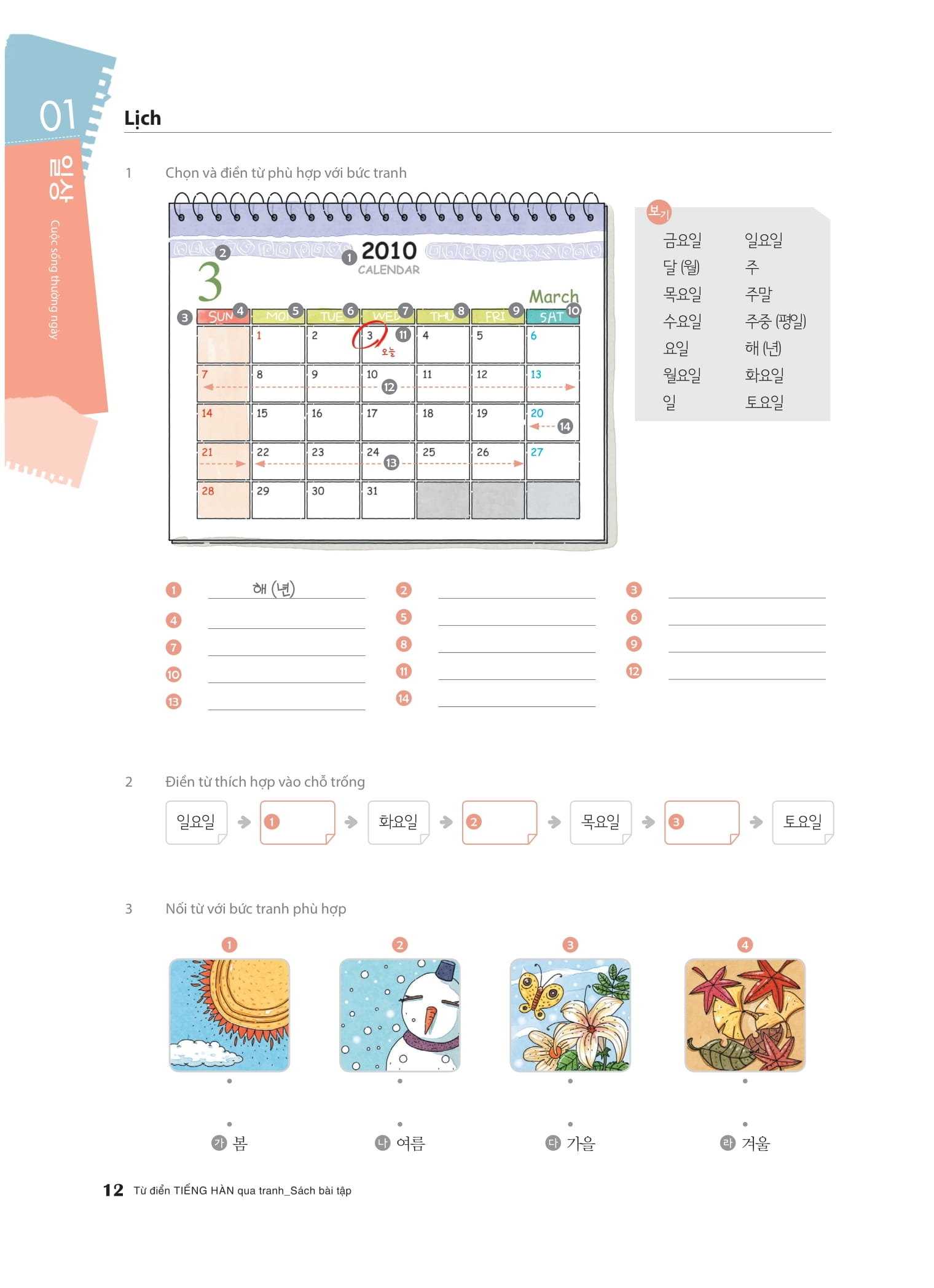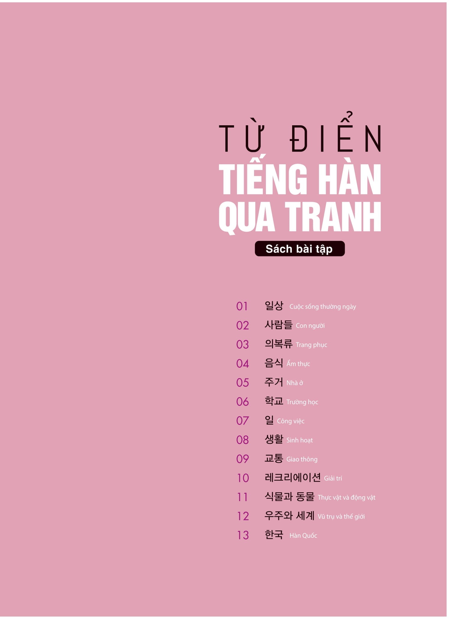 Cuốn Từ điển tiếng Hàn qua tranh – sách bài tập bao gồm 13 chủ đề lớn, mỗi chủ đề được thành 95 phần theo các phạm trù nhỏ hơn bám sát nhu cầu học từ vựng đa dạng nhiều chủ đề của người học trong thời gian gần đây.